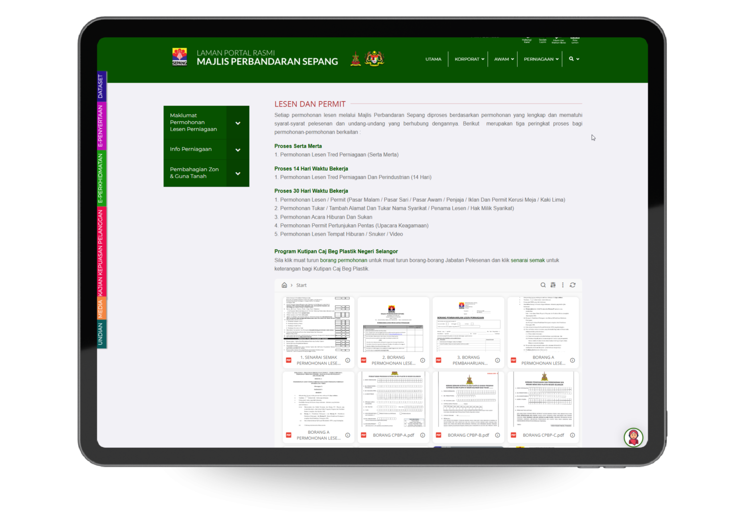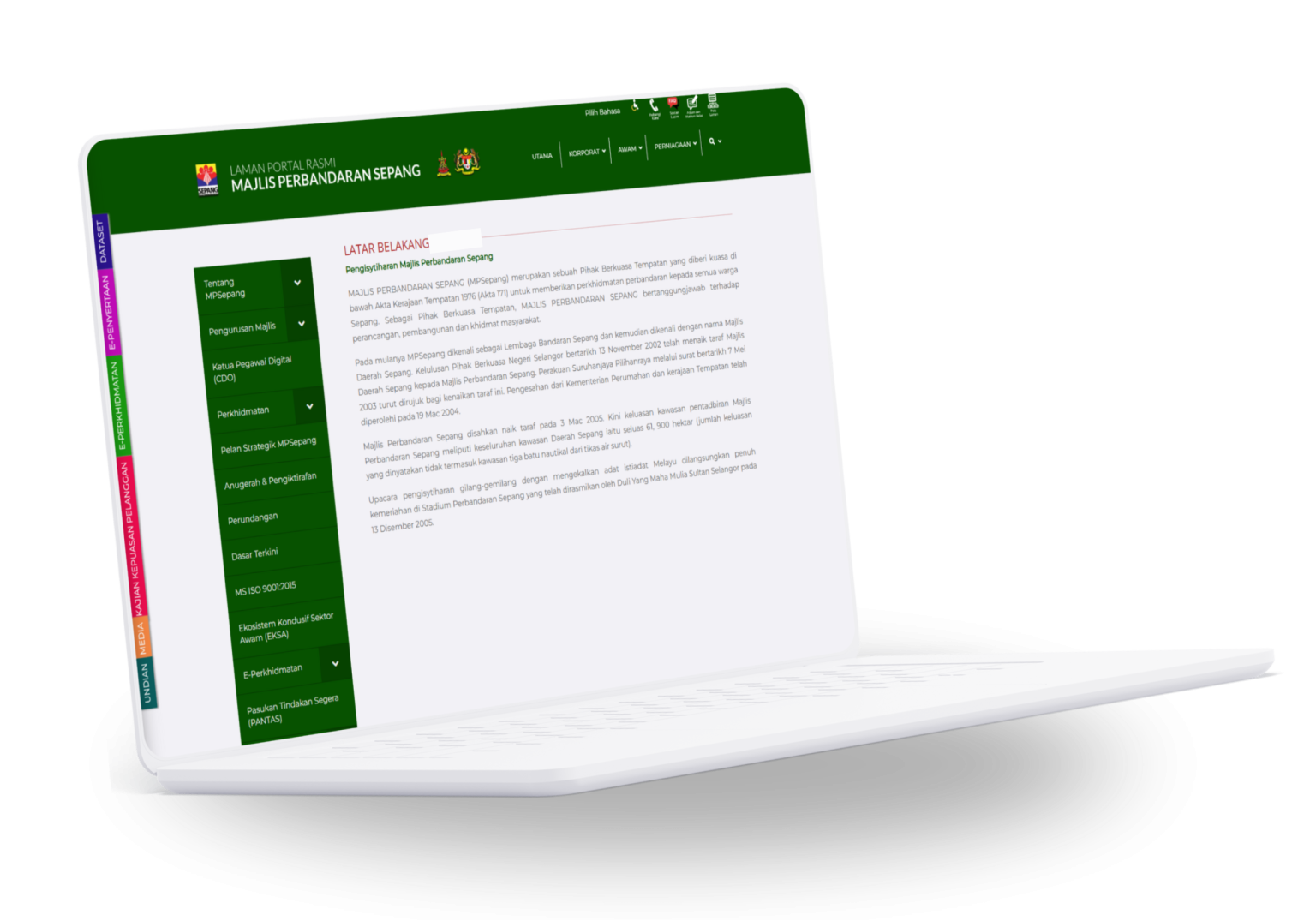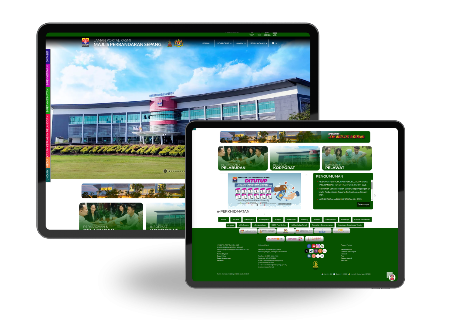 Revamped in 2022 with a fresh design utilizing HTML, CSS, and .NET, the official portal of Majlis Perbandaran Sepang (MPSepang) is a comprehensive online platform delivering a wide array of municipal services to Sepang residents. The portal offers e-Services such as e-Aduan (complaints), e-Cukai (taxes), e-Kompaun (fines), e-Tempahan (bookings), e-Bayar (payments), e-Penilaian (assessments), e-Borang (forms), e-Lesen (licensing), e-Perjawatan (recruitment), e-Bazar Ramadhan, e-My Pusara, and e-Perpustakaan, simplifying tasks like bill payments, public complaints, and business license applications. Additionally, it provides detailed information on MPSepang services, staff directories, strategic plans, public facilities, tenders, community activities, and supports e-Participation for resident feedback, fostering a connected and efficient community ecosystem.